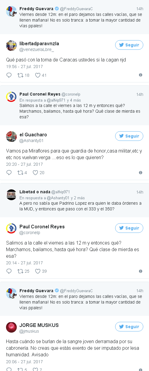 Ante tal afirmación los seguidores de la oposición venezolana enfurecieron, por ejemplo un usuario identificado como@venezuelaLbre dijo: “Qué pasó con la toma de Caracas ustedes si la cagan”.